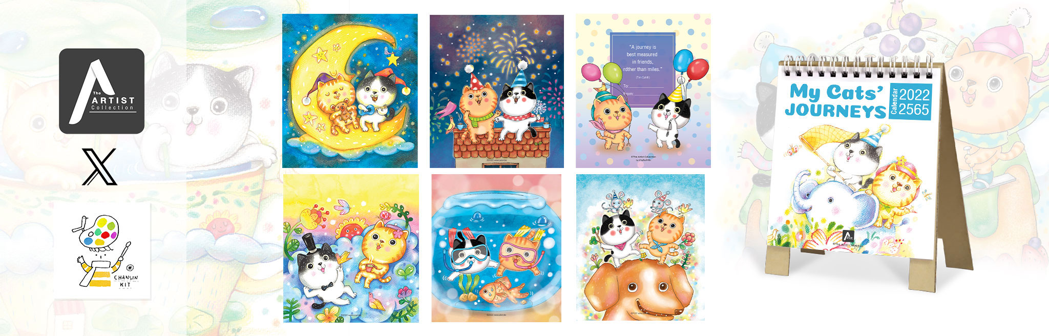ARTISTถ่านหินจำศีล ศิลปินนักวาดภาพประกอบนิทานชื่อดังผลงานที่ผ่านมานักวาดภาพประกอบผู้ออกแบบคาแรคเตอร์ที่มีชื่อเสียง มีผลงานมากมายในงานวาดภาพประกอบนิทานpocket book แบบฝึกหัดสำหรับเด็ก รวมทั้งสมุดโน้ตต่างๆ ARTIST COLLECTION Collection“My Cats’ Journey”